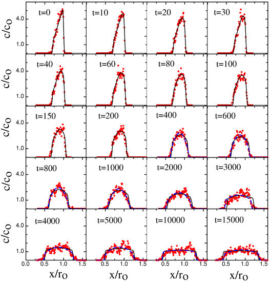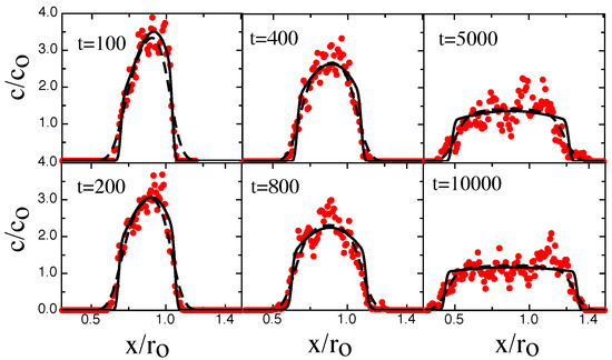 The relaxation process begins with a fast evolution of the initial ramped concentration profile (). This evolution gradually drives the concentration profile into an approximately parabolic profile shape for intermediate times (). At longer times, the profile shape approaches a flat equilibrium profile at the equilibrium concentration . In order to remove the effects of center-of-mass diffusion from the retraction profiles, which would lead to additional broadening of the profiles, the profiles at different times have been shifted so that the position of the center-of-mass remains constant. The agreement between the BD-results and NPDE model is excellent but not perfect. The NPDE model captures the BD results extremely well on a semi-quantitative basis, for example predicting the evolution of the shock-wave and the gradual approach towards the steady-state profile (Figure 4). There are details, however, that the NPDE approach does not capture, for example the concentration tail at in Figure 4 is not described correctly.