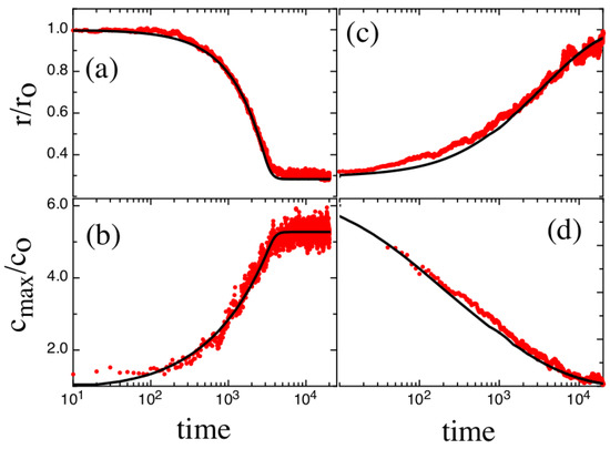 The chain extension and maximum concentration for a dynamic compression (a,b) and retraction (relaxation) process (c,d). The red line corresponds to BD results; the black curve corresponds to NPDE model output corresponding to the profile fits shown in Figure 4 and Figure 6. The maximum profile concentration for the BD output for the transient compression process is obtained by taking a three-point running average of the simulation data to suppress concentration fluctuations at the peak position. The maximum profile concentration for the BD output for the retraction process is obtained by performing a fit of the concentration profile to a parabolic concentration model. The approach minimizes the influence of thermal fluctuations on the concentration maximum as the profile approaches equilibrium.