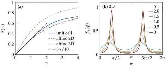Shear alignment of tube segments. (a) Strain-dependence of the nematic order parameter : affine scaling, as obtained for two- and three-dimensional solutions of phantom rods (Section 4.4), and the numerical estimate from the unit-cell model [] (see Section 4.5). Up to strains of order one, the results are well captured by the linear asymptotic scaling of Equation (3), while flattens out for larger strains, implying that perfect shear alignment is hard to achieve, even if quite substantial strains are imposed; (b) The angular distribution of the two-dimensional phantom-rod solution, according to Equation (19). With increasing strain the bimodal structure becomes more pronounced.