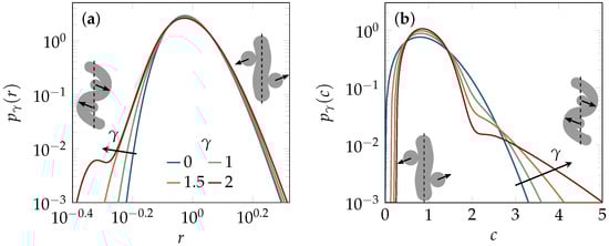 The predicted influence of shear on the master curves corresponding to and is illustrated in Figure 2. It reveals that develops broad tails at small arguments as the strain γ increases, whereas becomes more sharply peaked around its average (normalized to 1) and develops a tail at large arguments. The emergence of the tails can be traced back to so-called hairpin conformations (thermodynamically suppressed strongly contorted unit cell configurations [,]), as schematically sketched as insets in Figure 2. They are pulled tight under shearing, which accounts for the increasingly bimodal structure developing for large strains γ in both distributions, but is found to have only negligible impact onto the mean tube parameters.
