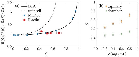 In the experiments, the thermal motion of a fluorescently labeled actin filament in the meshwork of unlabeled neighbor filaments is tracked over a fixed time span, long enough to identify the shape of the confinement tube. Two different setups were used to prepare the samples: a large micro chamber and a narrow capillary yielding almost isotropic and nematically ordered solutions, respectively. Varying the polymer concentration, this approach provides the dependence of the tube width on the alignment strength S, because the flow-induced ordering depends on the concentration—denser solutions yielding stronger alignment, see Figure 3b. The measured relation between the average tube width and alignment displayed in Figure 3a is consistent with the simulations and the BCA-prediction.