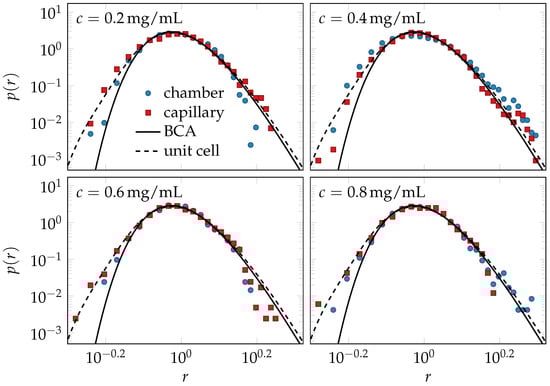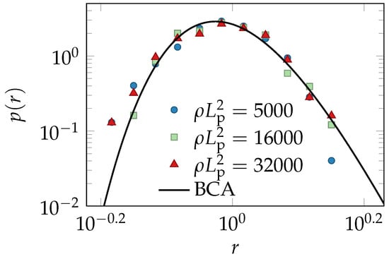 Reduced tube-width distribution obtained from the hybrid Monte-Carlo/Brownian-dynamics computer simulations [,,]. As expected from the BCA prediction, data for various polymer length concentrations ρ collapse onto a single master curve.