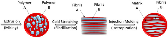 Two different approaches are often employed to avoid the drawbacks of this immiscibility. The first one consists in the addition of a compatibilizer to these blends. Mostly copolymers are used which can interact with both polymeric building components. When it is added to the mixtures, it will result in smaller dispersion of the second phase and better adhesion between the phases. Excellent mechanical properties of the materials could be achieved. In some cases, the compatibilized blends have obtained the tensile fracture behavior from brittle to ductile [21]. A second option is to transform the blends into microfibrillar composites (MFCs). MFC are an interesting class of composites where a high melting fibrillated polymer reinforces a lower melting matrix polymer by applying a specific processing sequence. They could be utilized in a wide range of applications because of improved mechanical properties such as strength and stiffness [12,15,16,22]. The manufacturing of MFCs consists of three basic steps (Figure 1):