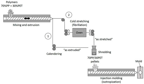 In this work, PP was used as a matrix, and PET as a reinforcing element. Materials were prepared in a weight ratio of 70/30 PP/PET. The sample preparation was divided into IMB and MFC preparation, respectively. The IMB samples were prepared in two basic steps (Figure 2, processing route 1): Extrusion and injection molding. The PP and dried PET pellets were properly dry-mixed in a fixed weight ratio of 70/30 before being added to the hopper. The first step, melt blending, was done at the processing temperature of the component with the higher Tm using a twin-screw extruder (Coperion ZSK18, Stuttgart, Germany) with a die opening of 19 mm × 2 mm. The screw speed was set at 120 rpm and the barrel temperatures were placed from 205 to 260 °C. The extrudate has been obtained as a sheet with dimensions of 25 mm × 1 mm, by passing through calander rolls, which were cooled down to ~15 °C. Further on, the sheets were shredded and injection molded with a BOY 22S injection molding machine (BOY, Neustadt-Fernthal, Germany). In order to study the effect of injection molding temperature, samples were injection molded at three different Tim: 210, 230, and 280 °C.