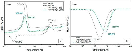 DSC thermograms of PP IM, PET IM, 70PP/30PET IMB, and 70PP/30PET MFC during (a) heating; and (b) cooling.