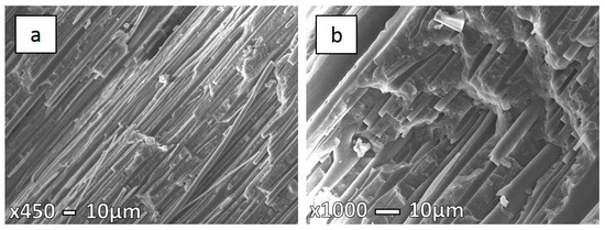 Micrographs presented in the Figure 7, Figure 8 and Figure 9 show the specimen fracture of MFC in the parallel direction to injection molding flow. It was hard to measure the exact longitude of fibers from these micrographs as the matrix was not removed, so some fibers are hidden, while the diameters were measured (Table 3). As mentioned earlier above, coalescence has a significant influence for PET fibers due to low PET viscosity. Hence, a significant possibility is that long fibers deform and, afterwards, stick together. This is more likely in the case of higher processing temperatures, but we cannot exclude that it could happen during lower processing temperatures. The obtained microstructure of MFC made at 210 °C (Figure 7a) clearly indicates the uniformity in fibers, as well their size. On the other hand, in the case of the sample at 230 °C (Figure 8) a larger variation in fiber diameter can be observed, as well as some necking through the length of the fibers.