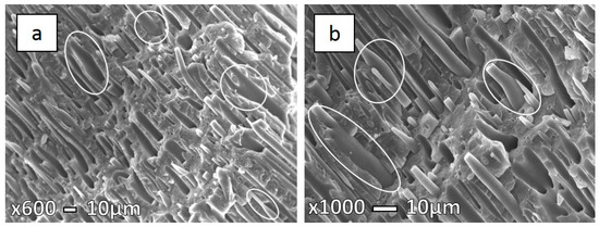 SEM micrographs of freeze-fracture surfaces in the parallel direction under liquid nitrogen of 70PP/30PET MFC at 230 °C (a) low magnification (×600); and (b) high magnification (×1000).