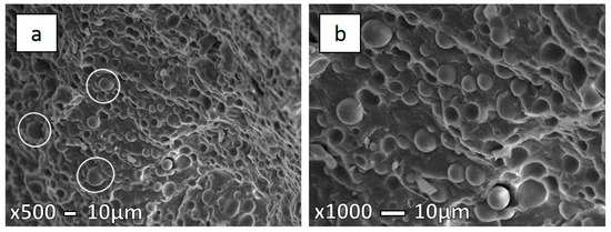 Morphological control of the dispersed phase is extremely important to achieve good properties for polymer blends and microfibrillar composites [2,4,9,25,37,38]. Figure 5 represents SEM micrographs of PP/PET composition with 30 wt % PET after extrusion, stretching, and injection molding at 210 °C. The unstretched blend shows a typical incompatible morphology (Figure 5a), where the spherical PET particles with a diameter ranging between 1–5 μm are found to be distributed in the PP matrix. Additionally, it can be seen that the PET particles exhibit a uniform dispersion in the PP matrix, with no adhesion between the two phases, which indicates a completely immiscible blend [2,4]. This morphology is very convenient for stretching and making fibers, and later, MFCs.
