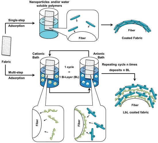 Recent concerns about the toxicity and sustainability of commonly used FRs have opened the way for the development of greener and efficient solutions. In this scenario, nanostructured coatings have attracted the interest of the scientific community [18,19,20]. Among “old” and “new” coating deposition techniques, the nanoparticle (NP) adsorption [21,22] and the layer by layer (LbL) assembly [23,24,25,26,27,28,29,30,31] have been studied and reinvented to match the FR purpose. Both techniques are very simple and straightforward as they rely on the single-step or multi-step surface adsorption of nanoparticles or polyelectrolytes from diluted (≤1 wt %) water-based suspensions or solutions, as shown in Figure 1.