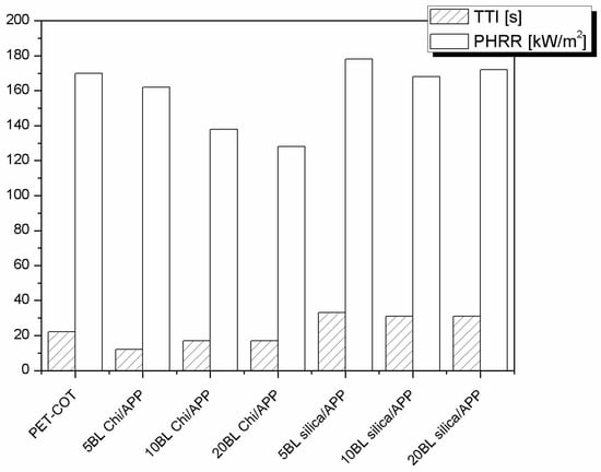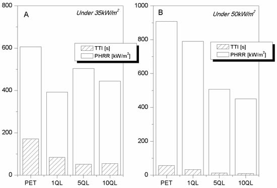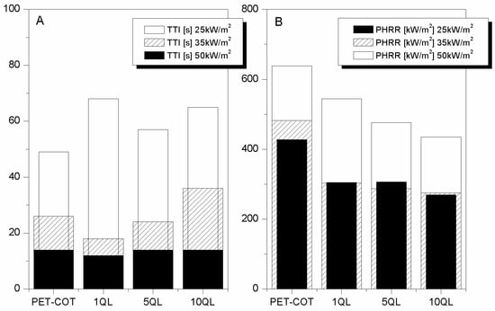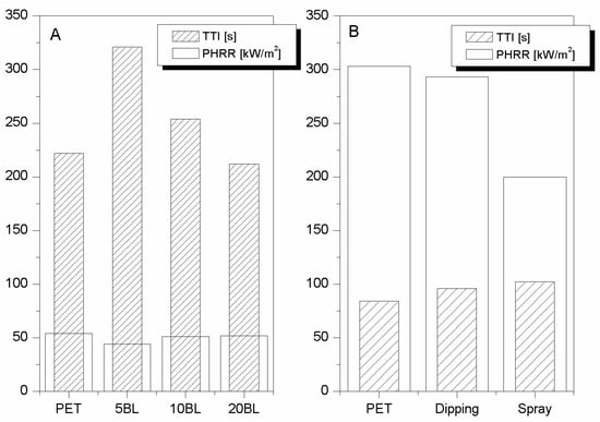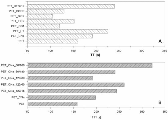 TTI values of nanoparticle (NP)-treated polyethylene terephthalate (PET) fabrics (A) and treated initially by plasma and then with CNa suspension (B) [33,35]. Data obtained by cone calorimetry at 35 kW/m2.