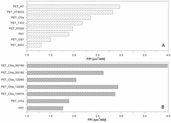FPI values of NP-treated PET fabrics (A) and treated initially by plasma and then with CNa suspension (B) [33,35]. Data obtained by cone calorimetry at 35 kW/m2.