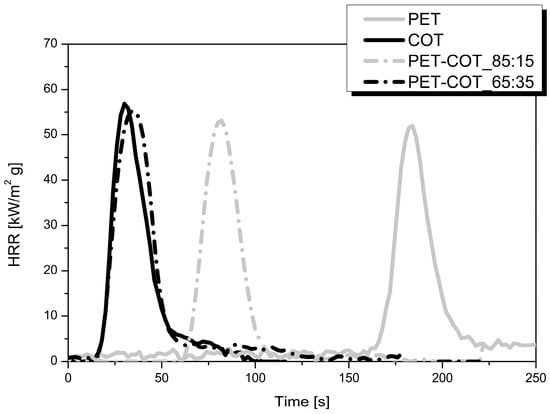 Heat Release Rate (HRR) curves of PET, COT, PET-COT_85:15 PET-COT_65:35 fabrics. Data obtained by cone calorimetry under 35 kW/m2.