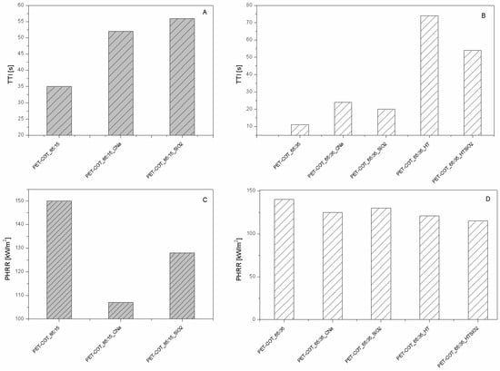 As far as CNa is concerned (Table 5 and Table 6), both blends exhibited a higher TTI (Figure 5A,B) and a lower PHRR (Figure 5C,D) due to the presence of NP. Referring to silica, the NP effect is comparable for the two substrates; no significant differences in performances were observed, also in terms of FPI value improvements (see Figure 5). For the blend having a higher cotton amount, HT was tested as well, since as described before, alone or in combination with silica it exhibited good performances for both PET and cotton fabrics [22]. In such cases, the best performances were achieved for the blend treated with one layer of HT, even though significant improvements were achieved also by coupling HT with silica. The latter results highlight how the subsequent adsorption of oppositely charged NPs in a layer by layer fashion can be the right route for the assembly of a performing flame retardant nanocoating.