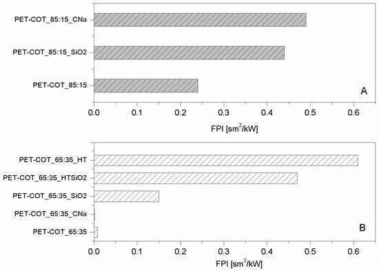 FPI values of NP-treated PET-COT_85:15 (A) and NP-treated PET-COT_65:35 fabrics (B). Data obtained by cone calorimetry at 35 kW/m2.