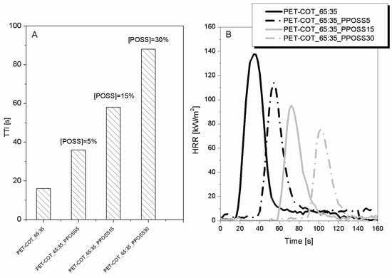 For a possible industrial application, POSS has proven to be the most promising NP to improve PET flame retardancy. Indeed, following the ISO15025 standard, these samples did not burn when exposed to a 2.5 cm methane flame. Unfortunately, the same trend was not observed for a PET-COT blend. Thus, combination of a phosphorus-based flame retardant (namely, Pyrovatex®-like [6]) with POSS was experimented in order to enhance the overall flame retardancy level of such blends. Figure 6 shows the collected results by cone calorimetry for PET-COT_65:35 treated with Pyrovatex® at 10 wt % add-on (the add-on normally employed is 19 wt %) and different POSS amounts (namely, 5, 15, and 30 wt %). By increasing the POSS amount, TTI increases (up to 500% improvement) and PHRR decreases (up to 50% reduction) in a remarkable way (Figure 7A,B, respectively).