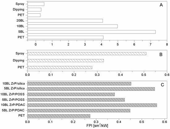 FPI values of untreated and LbL-treated PET fabrics (A: ref. [25], B: [26] and C: [27]). Data obtained by cone calorimetry at 35 kW/m2.