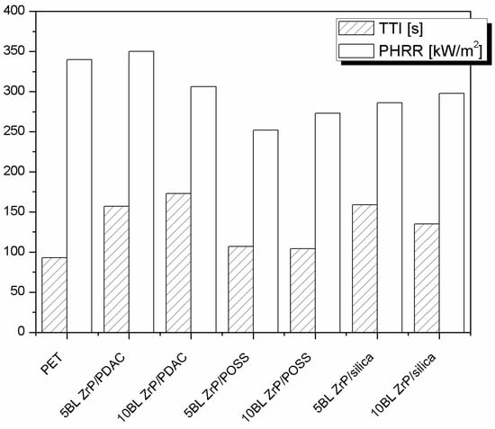 Pursuing the research, it became clear that it was necessary to change the perspective for further improving the performances of LbL architectures for PET. Indeed, although the ceramic barrier created by inorganic nanoparticles had some encouraging results, the final properties were not completely satisfying. Therefore, the research was addressed towards the design of new architectures consisting of both inorganic globular nanoparticles and species having intrinsic flame retardant features such as ammonium polyphosphate (APP) [43] or zirconium phosphate (ZrP) nanoplateletes [44]. The latter species was chosen as the negative counterpart in LBL assemblies coupled with a polymeric polyelectrolyte (namely, polydiallyldimethylammonium chloride, PDAC) and two inorganic nanoparticles (POSS and silica) [27]. So-treated PET exhibited a general increase of TTI and PHRR reduction (see Table 7 and Figure 10). More specifically, 10 BL ZrP/PDAC exhibited the highest TTI while 5 BL ZrP/ POSS the lowest PHRR. Calculating the FPI values for each sample and plotting them (see Figure 9C), it is possible to establish that the highest performances were however achieved by both 10 BL ZrP/PDAC and 5 BL ZrP/silica whose FPI values are comparable, although the latter sample can be considered the best, as it increases PET TTI from 93 to 159 s and reduces its PHRR by 20%. Comparing the performances of such samples (Figure 9C) with those of PET treated with 5 silica/silica BL (namely, dipping in Figure 9B) [25], it is clear that 5 BL ZrP/silica has superior flame retardant properties and thus the joint action between ZrP and silica represents the right route to follow.