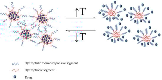 Conceptual illustration representing the drug release mechanism of a thermoresponsive micellar system with a lower critical solution temperature (LCST) (outer shell: thermoresponsive segments, inner core: hydrophobic segments). (Source: de Oliveira et al. [29]. Licenced under a Creative Commons Attribution License).