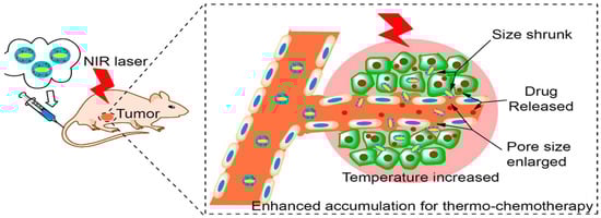 The physical interaction of polymers with its environment and a change in functional group chemistry are affected by the modification of the polymers conformational state and its solubility during formulation [50]. The most altered and well known property of thermoresponsive polymers is the drastic and reversible changes in solubility [51]. The advantages of using thermoresponsive polymers for cancer therapy are attributed to the mechanisms of targeted chemotherapy. Zhang and co-workers [52] fabricated gold nanorods loaded with doxorubicin for breast cancer which is induced through a thermo-chemotherapy mechanism activated through a Near InfraRed (NIR) Laser at 760 nm, 500 mW, and 16 W/cm2 (Figure 3). Their studies showed a higher accumulation of doxorubicin in tumours that were heated compared to those that were not exposed to heat [52].