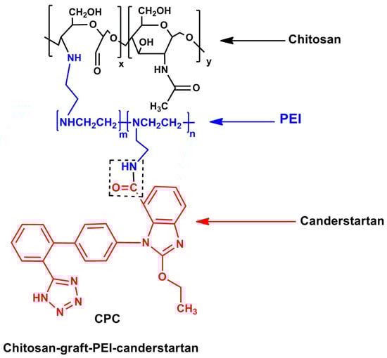 The molecular structure of the Chitosan-graft-PEI-candesartan polymer used in targeting pancreatic cancer cells [66]. (Source: Bao et al., 2014).