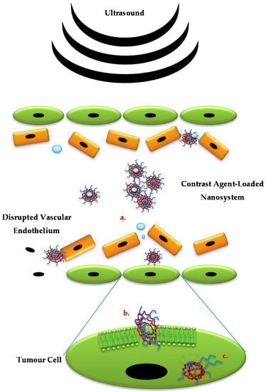In delivery systems fabricated from polymers that are not ultrasound-responsive, ultrasound delivery is achieved through the addition of agents such as Levovist, an ultrasound contrast agent that contains microbubbles [88] or perfluoropentane [89]. Those microbubbles are then coated with the drug-loaded polymer via formation of emulsions to acoustically trigger delivery of chemotherapeutic drugs, for example, chlorambucil [90]. Through a similar mechanism, the drug is delivered with efficiency to the intended site. When the ultrasound is transmitted, it interacts with the PFP and vaporisation occurs, thus causing the formation of microbubbles. As the microbubbles increase in volume and surface area, they facilitate drug release by bursting; causing temporary pores within the desired cell layers releasing the drug into the targeted cancerous tissue [91] as depicted in Figure 2.