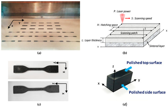 (a) building platform of EOS P395 machine regarding as the X–Y plane; (b) schematic illustration of the critical parameters in laser sintering process; (c) micro tensile specimens (ASTM D638, type IV) produced in the X–Y and X–Z planes; (d) the polished specimen for microstructure characterization in the X–Y (top surface) and Y–Z (side surface) planes.