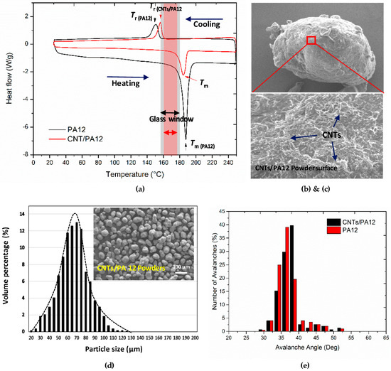 (a) DSC diagrams of PA12 and CNTs/PA12 upon heating and cooling at the rate of 10 °C/min; (b) size distribution of PA12 and CNTs/PA12 (0.5 wt %); SEM images of (c) the SEM image of an entire composite powder and then zoomed in to investigate the surface coating of CNTs; (d) the surface layer of CNTs which are lighten network structure; (e) avalanche angle graph indicating the required average angle to start and maintain the flow of the PA12 and CNTs/PA12 powders.