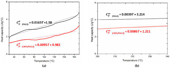 Specific heat of PA12 and CNTs/PA12 at (a) powder phase and (b) liquid phase.