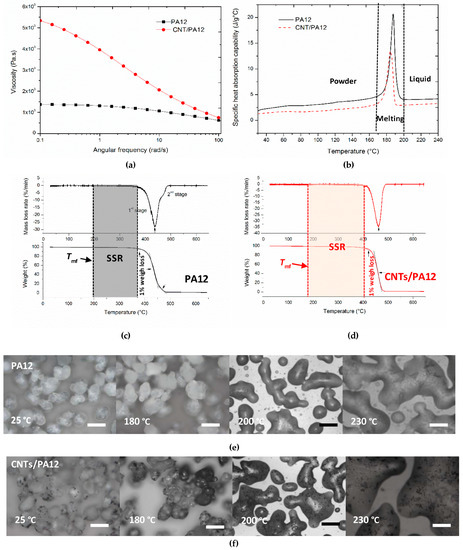 (a) melt viscosity of PA12 and CNTs/PA12 at 200 °C; (b) specific heat absorption of PA12 and CNTs/PA12 over the process temperature range; (c,d) TGA plots of decomposition processes of PA12 and CNTs/PA12, respectively; (e,f) the optical images of the fusion process of PA12 and PA12/CNTs powders (the scale bars are 100 µm).
