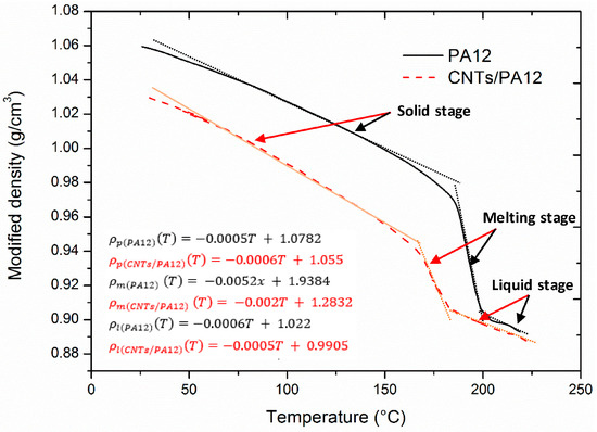 Increasing temperature from 25 to 225 °C, the modified densities of PA12 and CNTs/PA12 exhibit linear relationships with temperature in three stages via the solid, melting and liquid state.