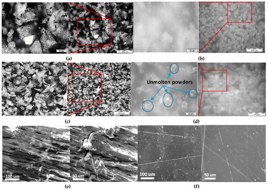 Optical images of microstructures of (a) CNTs/PA12 and (b) PA12 from the X–Y plane; (c) CNTs/PA12 and (d) PA12 specimen cross-section from the X–Z plane and the molten powders highlighted. SEM images of surface structures of (e) CNTs/PA12 and (f) PA12 through mechanical grinding and polishing.