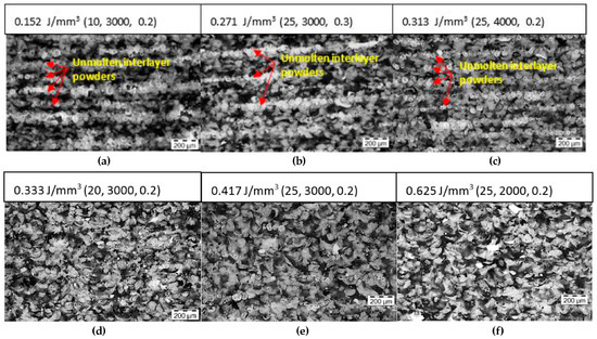 The microstructures of the CNTs/PA12 parts sintered upon varied laser input energy in the X–Z plane (power (W), scanning speed (mm/s), hatching space (mm)) (a–f).