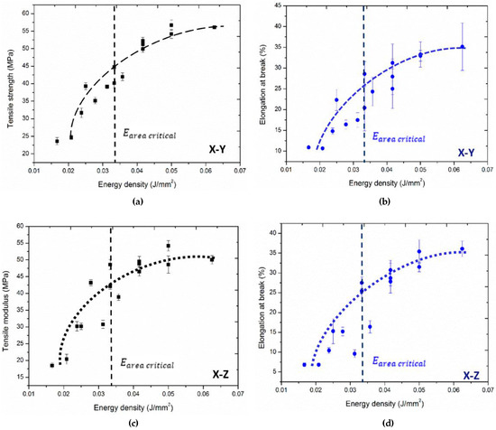 Energy density influences on (a) tensile strength and (b) elongation at break of specimens in the X–Y plane; (c) tensile strength and (d) elongation at break of specimens in the X–Z plane.