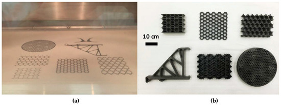 (a) The building platform of EOS P395 with the dimension of X, Y, Z (34 cm × 34 cm × 60 cm); (b) Light-weight CNTs/PA12 parts with complex geometric manufactured by SLS.