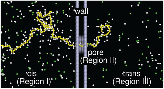 Initially, the chain head section is placed just across the pore and equilibrated with the head end constrained at the pore exit on the trans side. A translocation process is started by removing the constraint and switching on the electric field inside the pore. To guarantee the success of a translocation, a wall potential is set at the pore exit, visible only to the head monomer, which prevents the head monomer moving back to the pore. The electric field then drives the monomers in the pore toward the -direction, and the chain is transported gradually from the cis region to the trans one via the pore. In this study, the number of monomers of a chain N is varied from 32 to 384. The added salt is fixed at an amount of 256 molecules. The field strength is changed from to . The simulations are performed using Langevin dynamics simulations [87]. An illustration of the system is given in Figure 1. More details about the model and setup can be found in the paper [44].