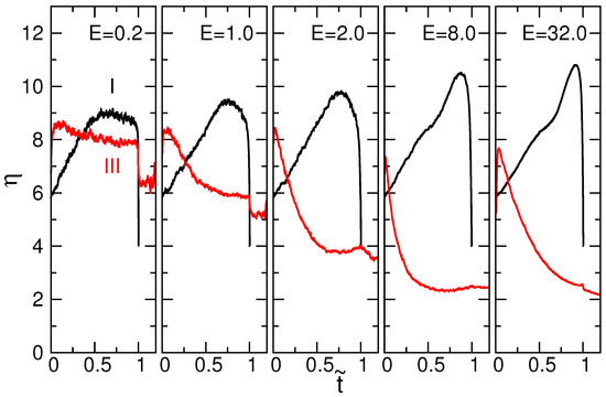 We can see that is about six in the cis region (I) at the starting point . It indicates that the chain acquires a coiled conformation at the beginning. As the process advances, increases, and thus, the chain is elongated. The stronger the electric field, the higher the value of . Therefore, the degree of elongation increases with the electric field. Near the end of the process , a drastic decrease is observed. It results from a significant decrease in the number of monomers on the cis side. When the number of monomers is small, the shape factor deviates from the above-mentioned typical value. For example, η for a three-monomer rod is six. A two-monomer segment has an η as small as four.