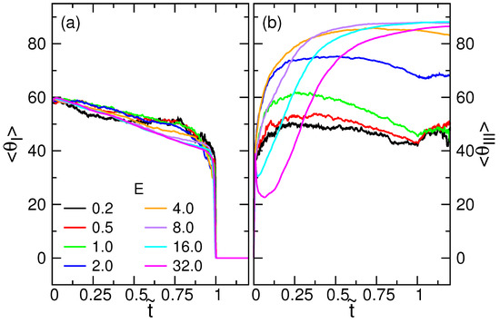 Variations of the averaged polar angle (a) and (b) in degrees , as a function of the scaled time at different driving electric fields E. The number of monomers of the chain N is 256.