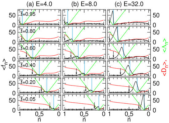 We can see that the tension (the black curve) did exhibit a surge for , and the surge propagates from the chain head ( to the chain end () in a threading process. The surge is skewed with the left-hand part being broader. Both the width and the peak increase with E. The left border of the surge defines the tension front, which has been indicated in the plots by a downward arrow. To understand the phenomena further, we calculated two distances to the pore for each monomer n. The first distance is the direct distance to the pore, and the second one is the contour distance along the chain backbone to the pore. In each run, and are equal to zero if the number n denotes the monomer in the pore region. However, the mean values and , averaged over the independent runs, are not. This is because at a given time, the monomers inside the pore may be different in different runs due to the stochastic nature of the threading process. Nonetheless, the minimum of and marks the most probable monomers in the pore at the moment. On the left of the minimum are the monomers in the cis region and on the right the ones in the trans region. is approximately a linear increasing function away from the pore because the distance is proportional to the number of the monomers, which connect the monomer n to the pore. displays a non-linear variation behavior on the two sides of the pore. On the trans side, the value is smaller, revealing that the sub-chain is closer to the wall than on the cis side. Noticeably, acquires a value close to in the cis region when n approaches the pore. The situation can happen only when the chain section is straightened by the driving force. The dashed lines in the figures depict the boundary of the straightened section, which are defined at . We saw that the effect of straightening becomes more important when E gets stronger. When E is weak (refer to Figure S2 in the Supplementary Materials for , and ), is significantly smaller than . No straightening of the chain or surge of tension was observed.