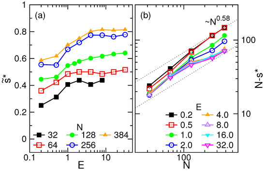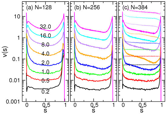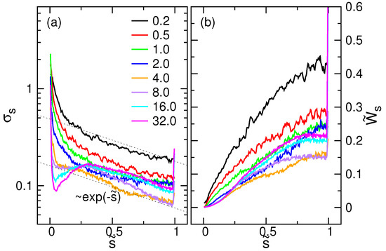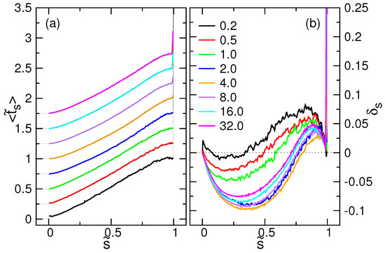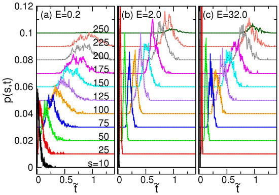 where , and are three parameters, which depend on s. The normalization condition for is . Integrating the time integral yields where can be linked to the waiting time function by . Therefore, we performed a two-parameter fit for the data of at each s, via and , using the information of waiting time for . The fitting was done by the Levenberg–Marquardt method [90], and the resulting curves have been superimposed on the simulation data with dashed lines in Figure 11. Good matches of the fitting were observed.