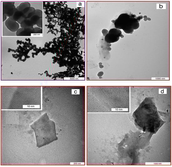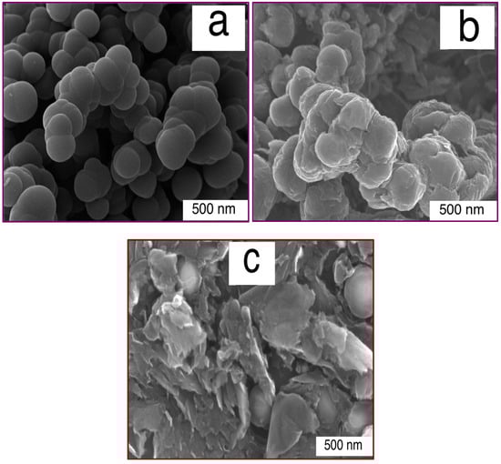 The synthesized CNS had a spherical shape, which made it a porous structure (Figure 1a). Besides, the synthesis of graphene sheets on the CNS surface resulted in a rough structure on the CNS surface. Therefore, by growing few-layered graphene on the CNS surface, a thin layer of graphene sheet covered the surface of the CNS (Figure 1b), while the growth of multi-layered graphene led to thick layers on the CNS surface, as well as graphene sheets occupying the space between CNS (Figure 1c and Figure 2b). This claim was proven by the width of the graphene sheet in Figure 2c,d, whereby the width and number of graphene layers of the multi-layered graphene were greater than those of the few-layered graphene. So, the diameter and size of the produced nanomaterials were approximately 200 nm in diameter for CNS (Figure 2a), and 300 nm × 400 nm and 1000 nm × 2000 nm for the FLG sheet (Figure 2c) and MLG sheet (Figure 2d), respectively.