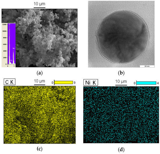 SEM/EDX image of Ni/C nanospheres (a); TEM image of Ni/C nanospheres (b); elemental mapping images of C at 950 °C (c) and Ni at 950 °C (d).