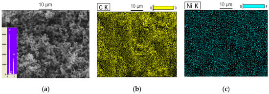 On the other hand, based on the SEM/EDX images in Figure 5a, carbon nanospheres at 1050 °C under H2/N2 flow and without C2H2 flow were composed of C, Ni and O with an atomic ratio of approximately 66:30:4. This result states that the amount of Ni particles increased while the O atoms decreased in comparison with carbon nanospheres at 950 °C. Hence, by increasing the temperature to 1050 °C under H2/N2 flow, more Ni salt was converted to NiO and more NiO was converted into Ni particles. EDX spectroscopy and elemental imaging in Figure 5b,c prove this claim. So, the percentage of Ni nanoparticles in the carbon nanospheres was 30%, and it increased by about 5% in comparison with the previous carbon nanospheres, which had 25% Ni content, and which revealed the presence of Ni particles around and on top of the carbon nanosphere surface.