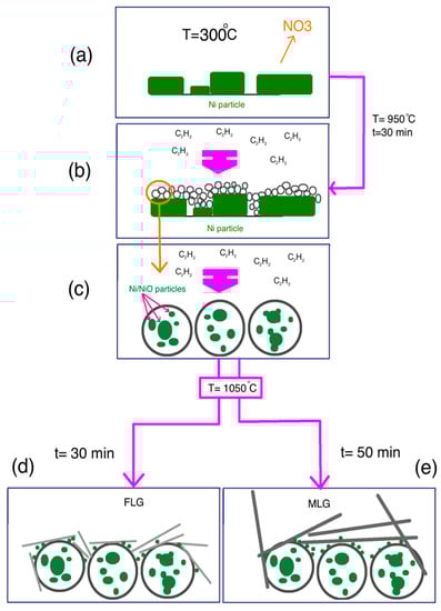 After that, at a temperature of 950 °C, acetylene gas was released into the CVD reactor and the H–C–C–H bonds in the C2H2 molecules started to break up to form C atoms (Figure 6b). During the reaction time, C atoms collected together to form a nanosphere of the deposited sp2 structure on active Ni atoms, and then surrounded the Ni/NiO nanoparticles (Figure 6c). Finally, CNS with a network structure were generated, in which Ni/NiO nanoparticles were embedded in the carbon nanosphere matrix. After that, the acetylene flow was stopped. Then, to grow the graphene sheets on the CNS surface, the temperature was increased to about 1050 °C. While the reactor was reaching this temperature, more Ni particles were converted into Ni/NiO nanoparticles and deposited on the produced carbon nanosphere surface. Finally, when the temperature reached 1050 °C, acetylene gas filled the chamber and the graphene sheets started to grow on the CNS surface for 30 min and 50 min to form few-layered graphene and multi-layered graphene, respectively (Figure 6d,e) [18].