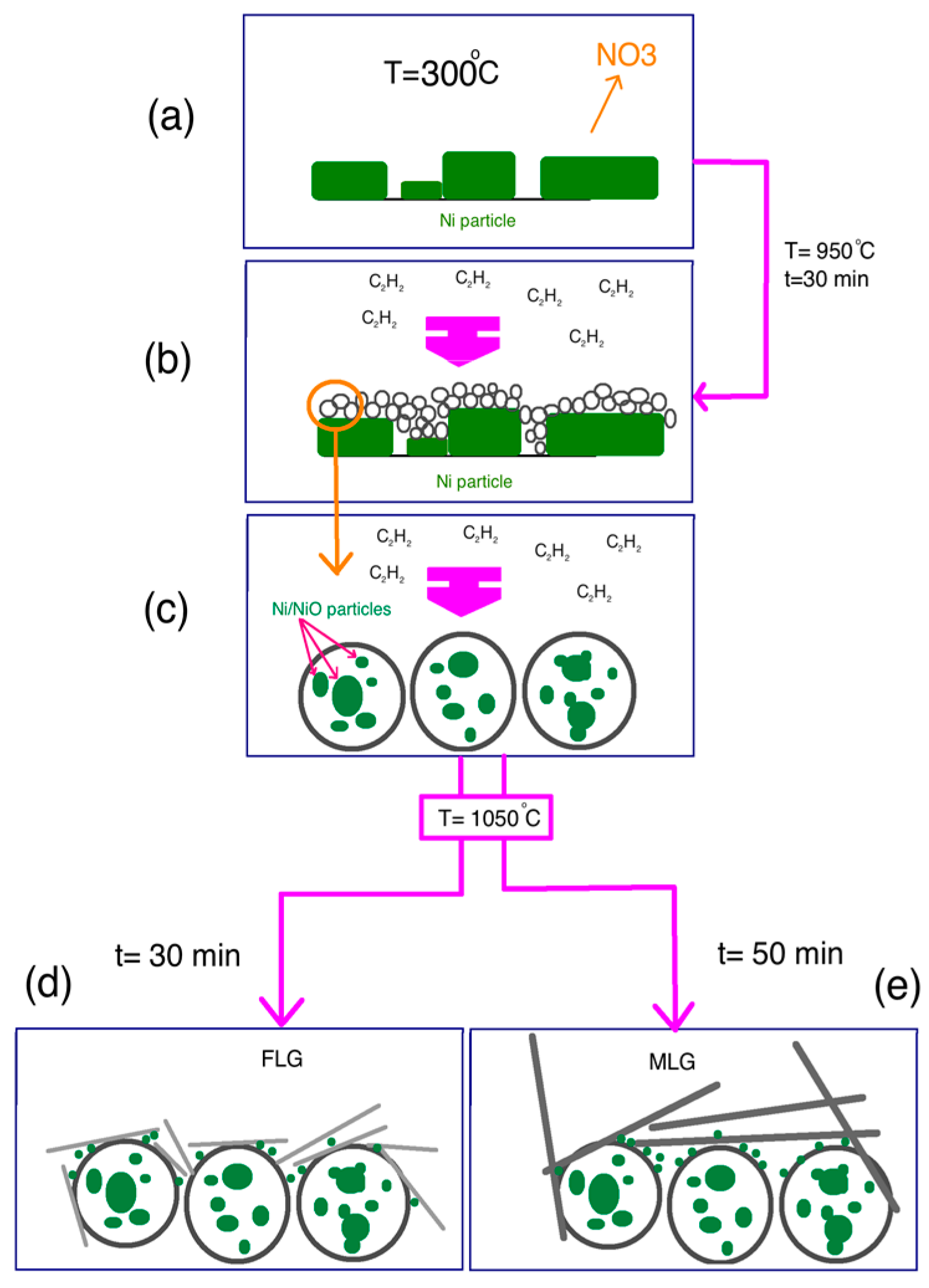 Schematic illustration of process: (a) NO3 elimination and formation of Ni/NiO, (b) synthesis of carbon nanosphere, (c) zoon in of carbon nanosphere encapsulated Ni/NiO particles, (d) few-layer graphene and (e) Multi-layer graphene productions on CNS.