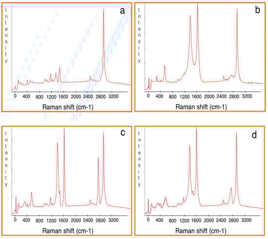 Moreover, Raman spectroscopy was employed to further analyze the interaction between the different nanofillers and polymer matrix, which should be reflected in the change in peak shift or peak width [23]. Based on the results in Figure 8a–d, the peaks related to nanocomposites were sharper than those of pure polymer because of the resonance and absorbance effects of the nanofillers. In other words, the peaks of the Raman spectra for the nanocomposite were significant because of the high intensity of the nanofillers with the polymer matrix, while the peak for pure polymer did not appear. Subsequently, the existence of nanofillers in the polymer matrix led to an increment in the intensity of the G and 2D peaks in the polymer composite because of the enhanced interaction between the polymer and the filler. Furthermore, the presence of graphene sheets on CNS improved the interaction with the polymer matrix, and also it was finally understood that CNS-FLG had a stronger adhesion to the polymer matrix in comparison to CNS-MLG.