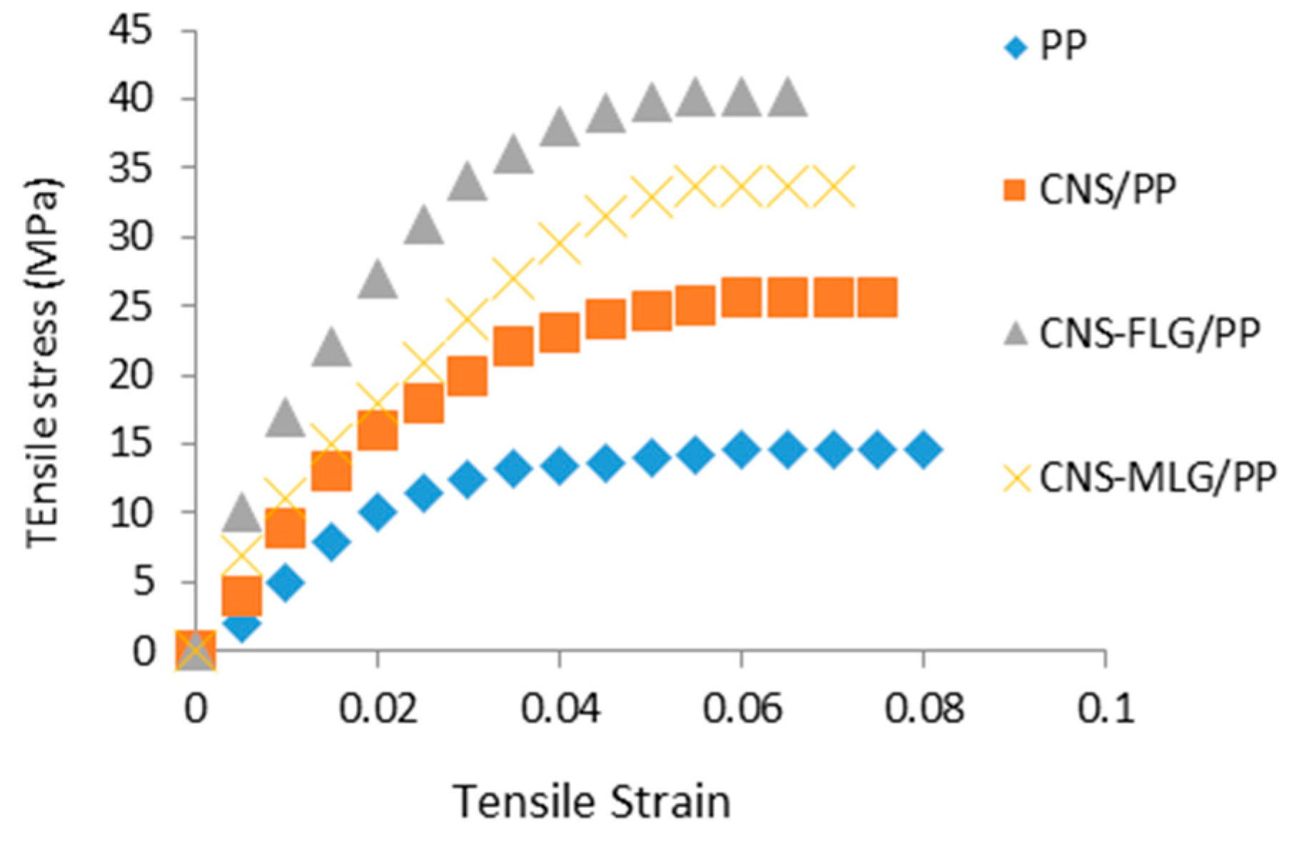 Tensile stress–strain graph of PP, CNS/PP, CNS-FLG/PP and CNS-MLG/PP.
