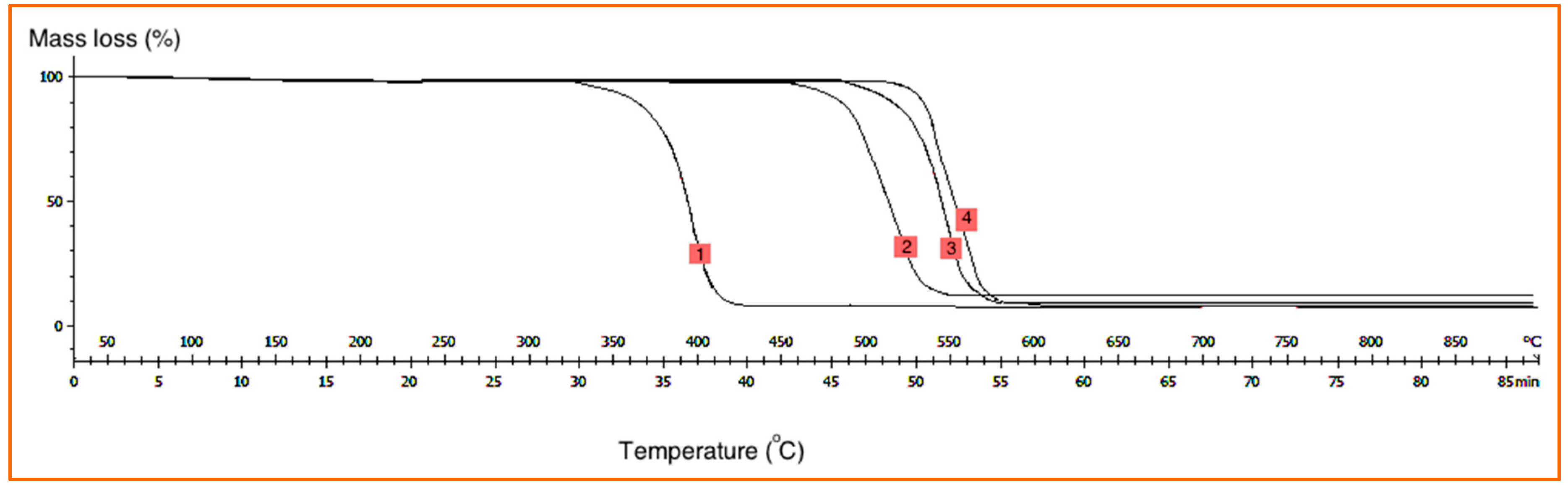TGA graphs of the various polymer composites (1: PP; 2: CNS/PP; 3: CNS-MLG/PP and 4: CNS-FLG/PP); Horizontal axis: Temperature (°C); Vertical axis: Loss weight percentage (wt %).