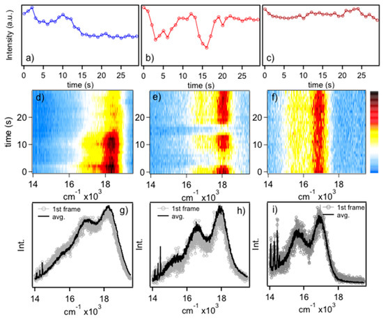 Examples of: PL (photoluminescence) integrated intensity transients (a–c); PL spectra transients (d–f); and PL spectra (g–i) of the first frame (gray) and average (black) of the “blue”, “red” and “ultra-red” emitting forms of MEH-PPV (poly[2-methoxy-5-(2-ethylhexyloxy)-1,4-phenylenevinylene]) single molecules. Spike features appearing on the lower energy tail of the PL line shape correspond to plasma lines from the laser excitation source.