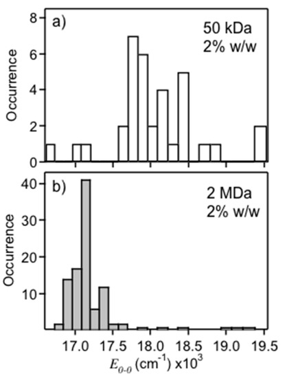 Histograms of the PL E0-0 maxima for MEH-PPV single molecules dispersed in: 50 kDa (a); and 2 MDa (b) polystyrene.