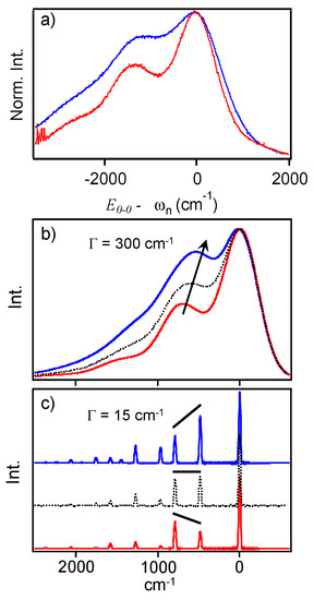 where Δk is the dimensionless vibrational displacement for the k-th mode, E0-0 is the energy of the electronic origin transition (cm−1), and Γ is a phenomenological damping factor (cm−1) that determines observed vibronic linewidths. This expression can be solved analytically provided that the ground and emitting state potential surfaces are well described by undistorted harmonic oscillators, i.e., no change in frequency between ground and emitting states, and the transition moment is constant.